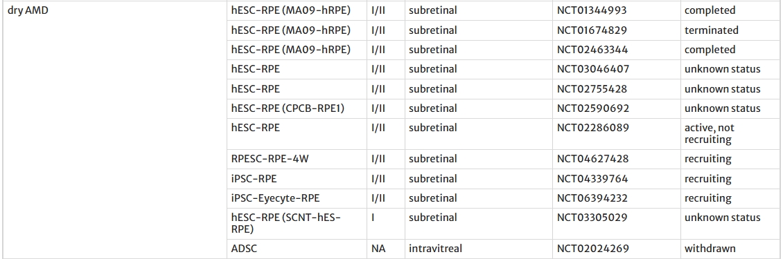 此外,還進行了其他試驗,以評估hESC-RPE細胞對AMD(NCT02463344、NCT01691261)、STGD(NCT01469832、NCT02445612、NCT01625559、NCT02941991)和AMD/STGD(NCT02903576)的安全性和有效性。