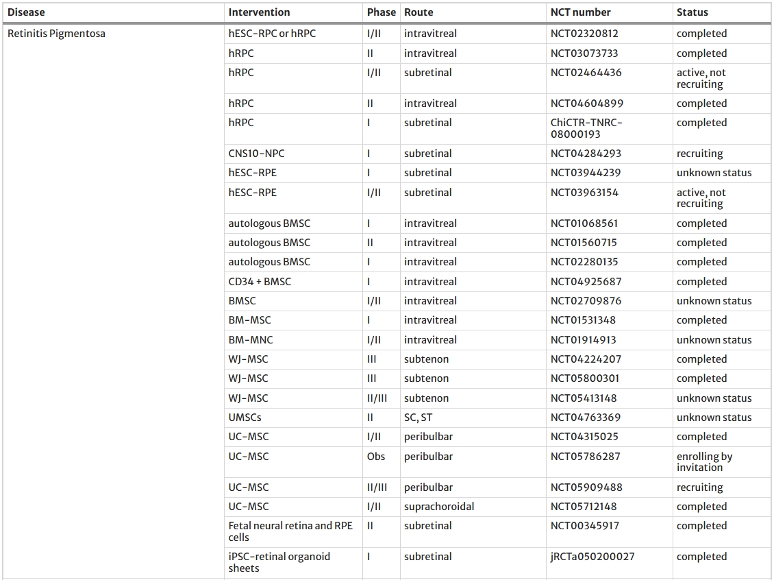 • 臍帶間充質干細胞(UCMSC)(NCT04315025、NCT05712148)與華通氏膠MSC(WJ-MSC)(III期試驗NCT04224207、NCT05800301)治療RP;