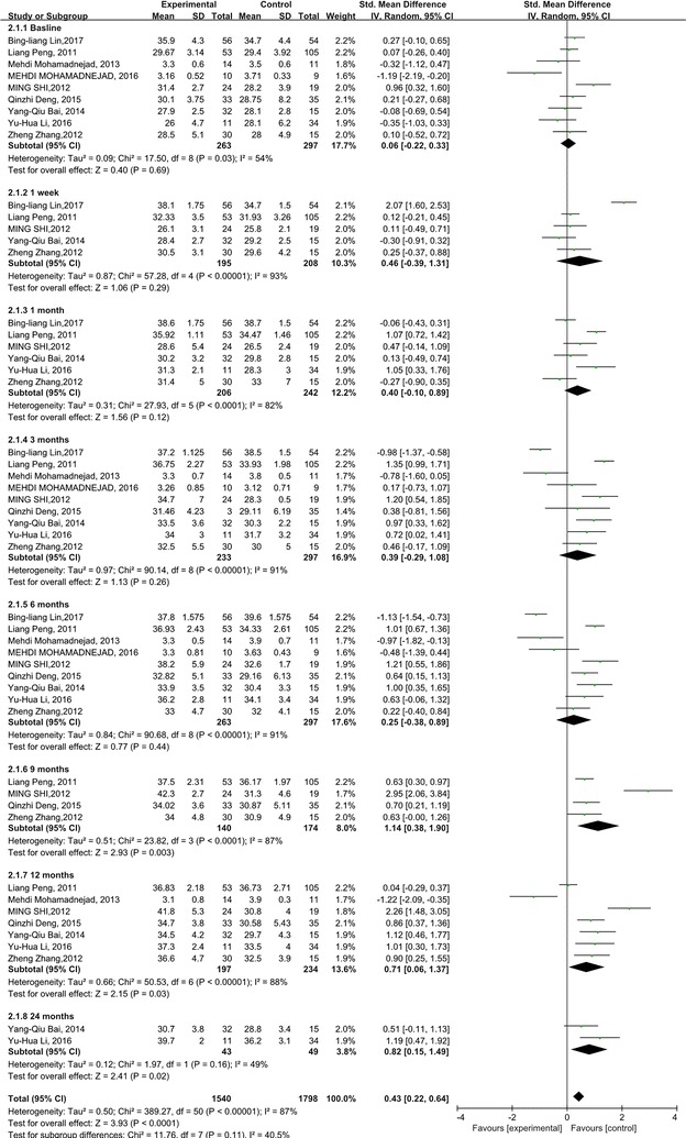 我們分析了ALB和INR水平,以研究干細(xì)胞療法對(duì)肝臟合成功能的影響。與對(duì)照組相比,干細(xì)胞治療后ALB 水平顯著升高 (p<0.0001)。但應(yīng)考慮ALB水平的異質(zhì)性(p<0.00001;I2=87%)。亞組分析顯示,干細(xì)胞治療后9、12、24個(gè)月ALB水平顯著升高(圖2)。
