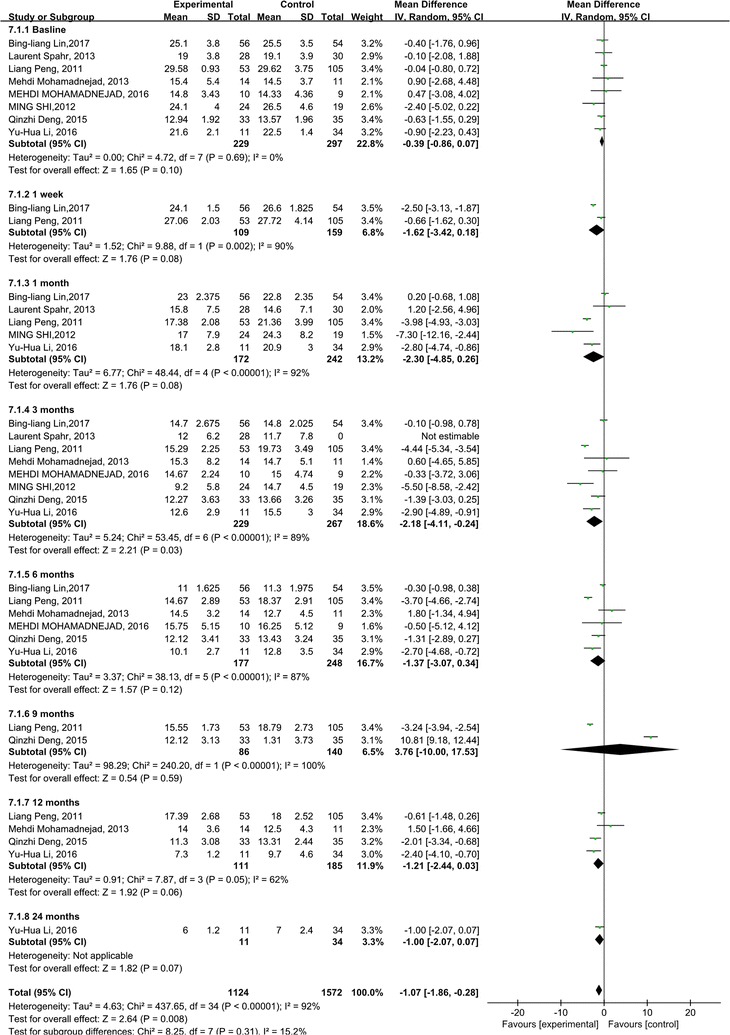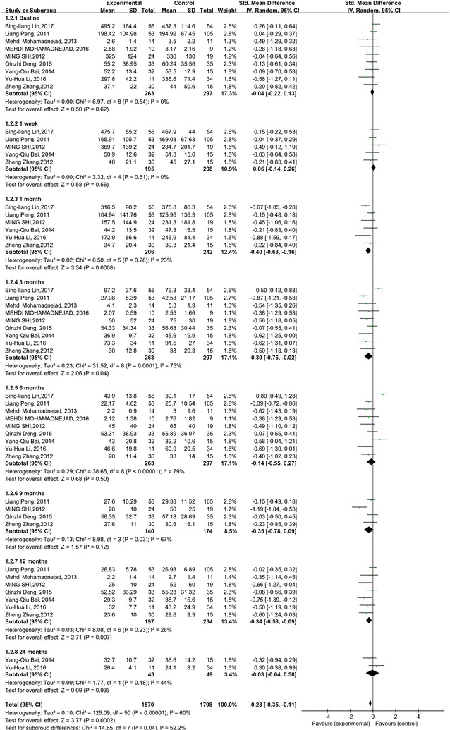 與對(duì)照組相比,干細(xì)胞治療后ALT水平顯著降低(p<0.00001)(圖5)。亞組分析顯示,干細(xì)胞治療組ALT水平也有所降低,在1周、1個(gè)月和6個(gè)月時(shí)間點(diǎn)均低于基線和相應(yīng)對(duì)照組。干細(xì)胞治療后9、12和24個(gè)月時(shí)ALT水平無(wú)顯著差異。關(guān)于1周、6和9個(gè)月時(shí)的ALT水平,未發(fā)現(xiàn)異質(zhì)性。但是,應(yīng)考慮1、3和12個(gè)月時(shí) ALT水平的異質(zhì)性。但這只能通過(guò)一兩項(xiàng)研究來(lái)解釋。