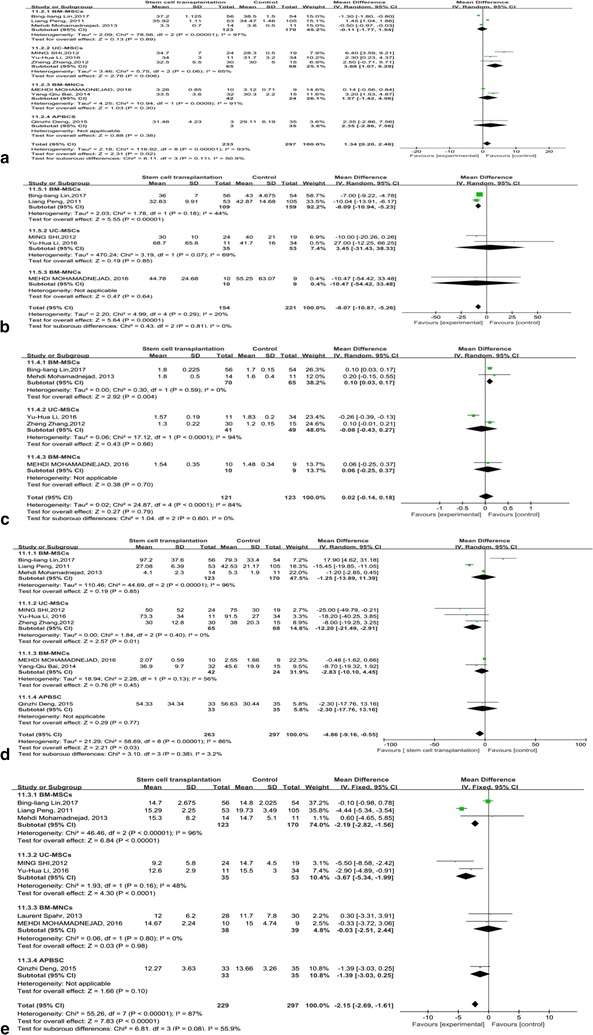 MELD評(píng)分主要用于評(píng)估終末期肝病的預(yù)后。我們觀察到干細(xì)胞治療組和對(duì)照組的MELD評(píng)分均有所下降。干細(xì)胞治療組和對(duì)照組之間存在顯著差異 (p =0.008)(圖6)。此外,盡管進(jìn)行了亞組分析,但這些研究的異質(zhì)性很高 (I 2 : 62–100%)。但這也可以?xún)H通過(guò)一兩項(xiàng)研究來(lái)解釋。