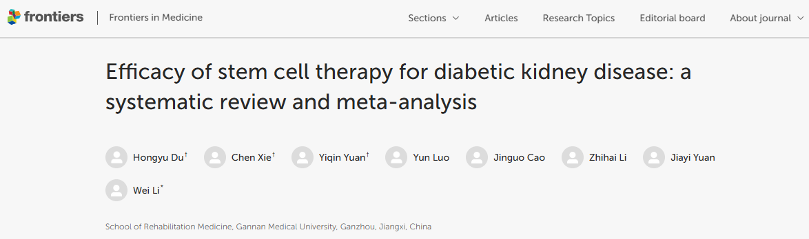 [1]:Du H, Xie C, Yuan Y, Luo Y, Cao J, Li Z, Yuan J and Li W (2025) Efficacy of stem cell therapy for diabetic kidney disease: a systematic review and meta-analysis. Front. Med. 12:1601900. doi: 10.3389/fmed.2025.1601900