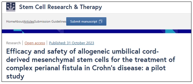 Juan Wei, Yufei Zhang, Chunyan Chen, Xiaoyue Feng, Zhao Yang, Jing Feng, Qiong Jiang, Jinjin Fu, Ji Xuan, Hong Gao, Lianming Liao and Fangyu Wang. Efcacy and safety of allogeneic umbilical cord-derived mesenchymal stem cells for the treatment of complex perianal fstula in Crohn’s disease: a pilot study. https://doi.org/10.1186/s13287-023-03531-0.