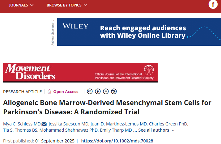 為驗證該假設,我們牽頭開展了一項II期雙盲、隨機、安慰劑對照試驗,旨在評估重復allo-hMSC輸注對改善PD患者運動及非運動癥狀的療效。(研究結(jié)果發(fā)表在期刊雜志《運動障礙主頁》上)[2]。