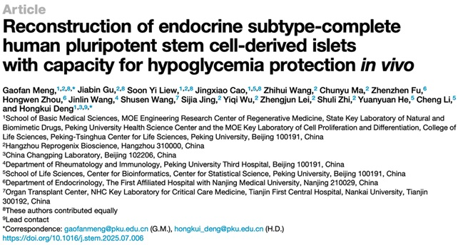 2025年8月8日,北京大學(xué)生命科學(xué)學(xué)院鄧宏魁團隊在國際頂級期刊《Cell Stem Cell》上發(fā)表了關(guān)于干細胞來源胰島功能重建的重大突破。[1]