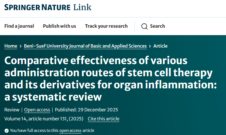 [1]:Purwatiningsih, W., Rantam, F., Aulanni’am, A. et al. Comparative effectiveness of various administration routes of stem cell therapy and its derivatives for organ inflammation: a systematic review. Beni-Suef Univ J Basic Appl Sci 14, 131 (2025). https://doi.org/10.1186/s43088-025-00730-x