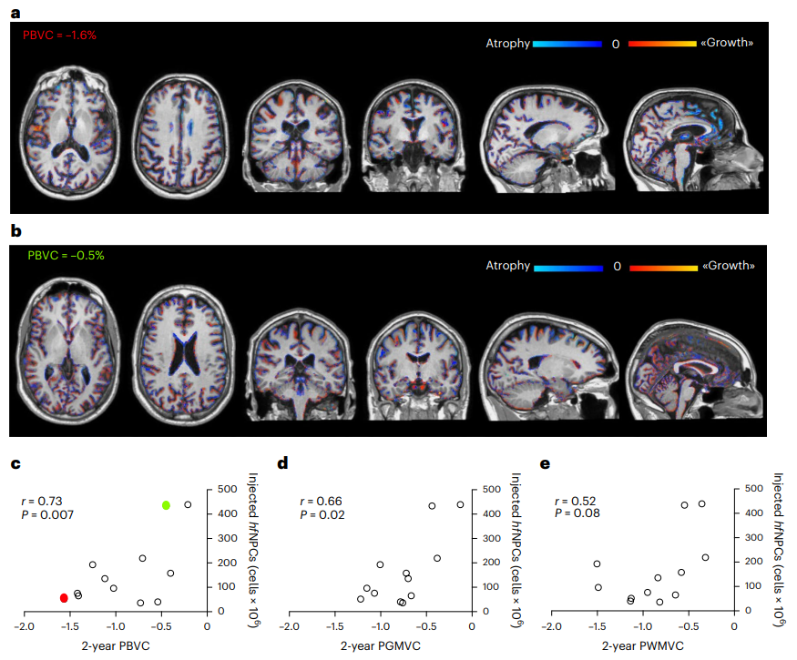 三個月后,每位患者又進行了一次腰椎穿刺,研究團隊發現,他們的脊髓液中的神經保護和抗炎分子都有所增加。每位患者在注射胚胎干細胞治療兩年后還接受了核磁共振掃描,那些注射最多胚胎干細胞的患者大腦灰質損失最少。