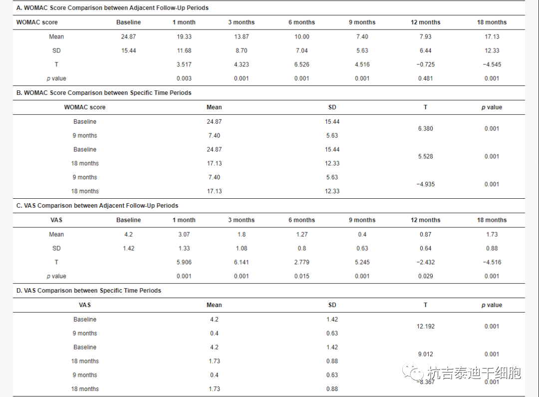 該研究最重要的發(fā)現(xiàn)是膝關節(jié)OA患者單次關節(jié)內(nèi)注射MF-AT可獲得令人滿意的臨床結(jié)果和功能改善,在18個月的隨訪中沒有發(fā)生不良事件,患者表現(xiàn)最好注射后9個月膝關節(jié)功能改善。
