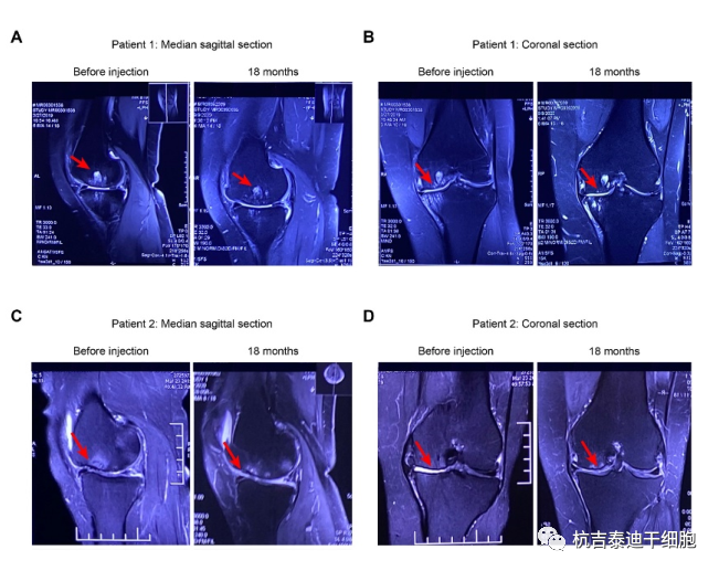 四十個膝蓋中的二十八個在注射前為RechtII級,十二個為RechtIII 級。注射后18個月,8例為RechtI級,22例為RechtII級,10例為 RechtIII級。Recht評分提高率為25%。在補充圖S1中,列舉了兩名患者在接受關節(jié)內(nèi)注射MF-AT之前和之后的MRI結(jié)果。在冠狀面和矢狀面上,我們可以看到與應用MF-AT之前相比,膝關節(jié)水腫略有減輕,但軟骨再生不明顯。