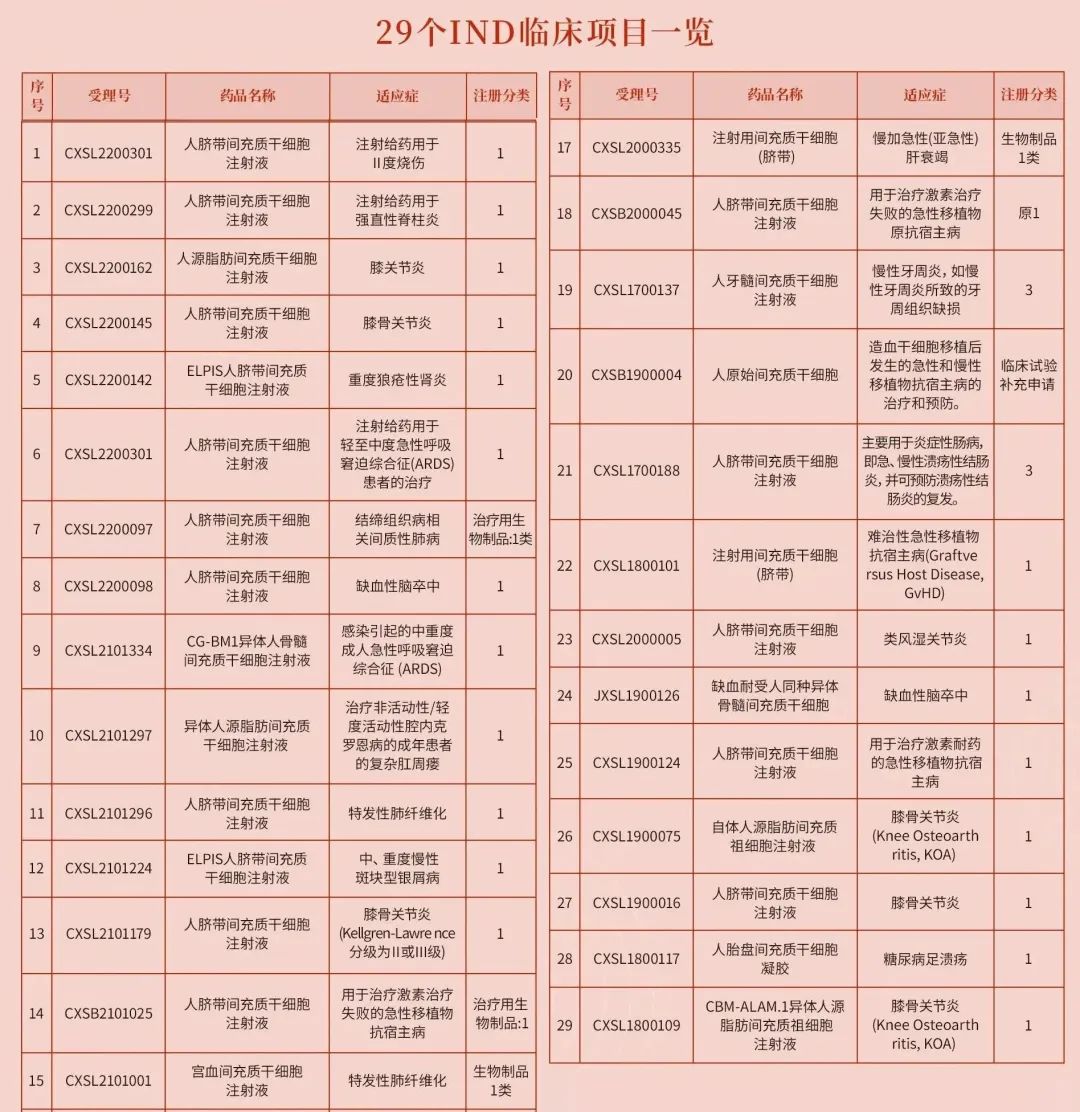 然而,在干細胞臨床應用方面根據國家藥品監督管理局藥品審評中心公示信息顯示,截止2022年10月31日,共有29個干細胞新藥項目獲得國家臨床默示許可。分別是胎盤、臍帶、牙髓、宮血、異體/自體脂肪來源的間充質干細胞,適應癥包括膝骨關節炎、類風濕關節炎、糖尿病足潰瘍、銀屑病、肺纖維化、肝衰竭、卒中、急性呼吸窘迫綜合征、牙周炎、克羅恩病和 GvHD