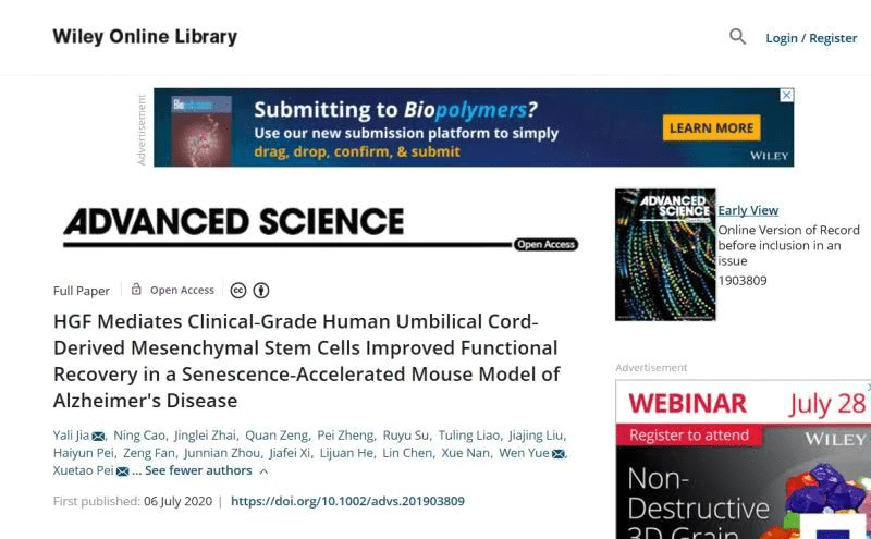 2020年7月6日,國際學(xué)術(shù)期刊《Advanced Science》在線發(fā)表了軍事科學(xué)院軍事醫(yī)學(xué)研究所和華南干細(xì)胞與再生醫(yī)學(xué)研究中心的最新研究成果“HGF介導(dǎo)臨床級人臍帶間充質(zhì)干細(xì)胞改善功能恢復(fù)在衰老加速的阿爾茨海默氏病小鼠模型中”。