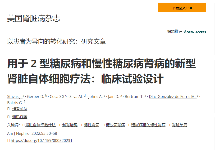 背景:干細胞療法探索慢性腎病患者未滿足的臨床需求,并有可能改變通往終末期腎病的途徑。我們描述了一項II期多中心臨床試驗的設計和基線患者特征,該試驗利用新型腎臟自體細胞療法 (REACT),通過經(jīng)皮入路直接腎實質(zhì)注射治療患有2型糖尿病腎病 (T2DKD) 的成人,以延遲或可能避免腎臟替代治療。