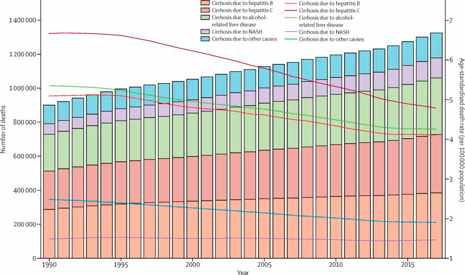 條形表示每年的死亡人數(shù)。線條指的是每年的年齡標(biāo)準(zhǔn)化死亡率。NASH = 非酒精性脂肪性肝炎。