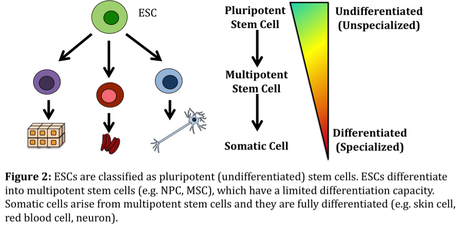 胚胎干細胞(ESC)存在于發育中的胚胎中。這些細胞被稱為多能細胞,這意味著它們有可能分化成人體中發現的所有細胞類型。ESC已被廣泛研究,以了解調節其“干細胞性”的分子途徑,以及引導分化為更專門的細胞類型的途徑(例如,一個ESC如何成為神經元,另一個ESC如何成為皮膚細胞) ?)。
