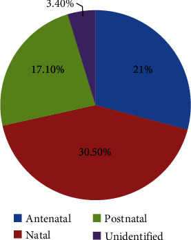 現在眾所周知,CP的主要危險因素是37周前分娩和出生體重低于2.5公斤;然而,還有一些其他問題在文獻中被發現是腦損傷的一些突出原因,其中一些包括發育期大腦畸形、遺傳原因、子宮內母親和胎兒感染以及各種其他問題。可能使發育中的大腦容易受傷的因素分為孕前、懷孕期間和出生后出現的風險因素。一項研究證實,母親受孕前的健康狀況是影響胎兒中樞神經系統的原因之一,在妊娠后期可能會導致腦癱。本研究將孕前定義為母親受孕前的健康狀況,產前定義為妊娠期,圍產期為分娩時,產后為分娩后。