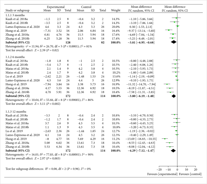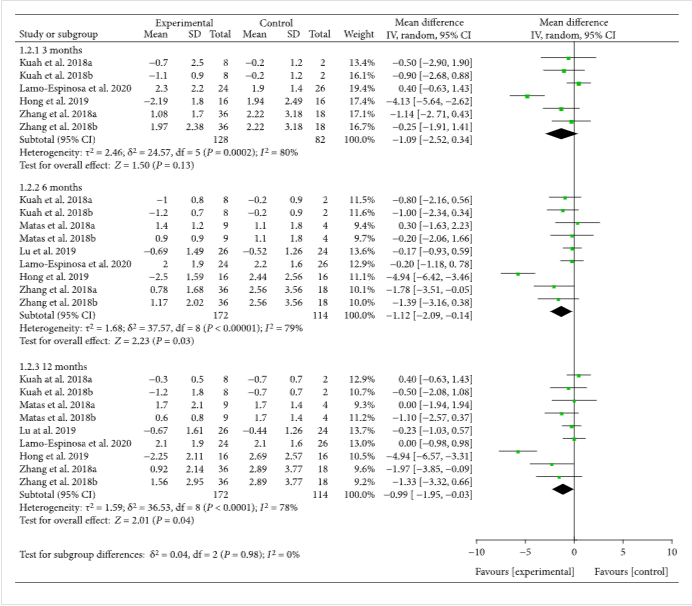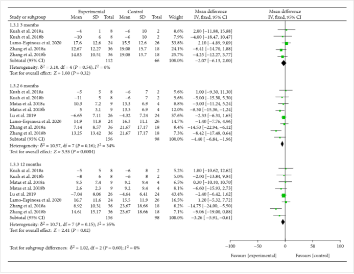 十三項(xiàng)臨床試驗(yàn)報(bào)告了具有精確值的VAS。結(jié)果還顯示,MSC注射后第3個(gè)月隨訪VAS較對(duì)照組有所降低[-1.11(-1.53??,-0.68),],且效果至少持續(xù)12個(gè)月[-1.77(-2.43,-1.12),](圖2)。VAS的改善可能具有臨床意義。