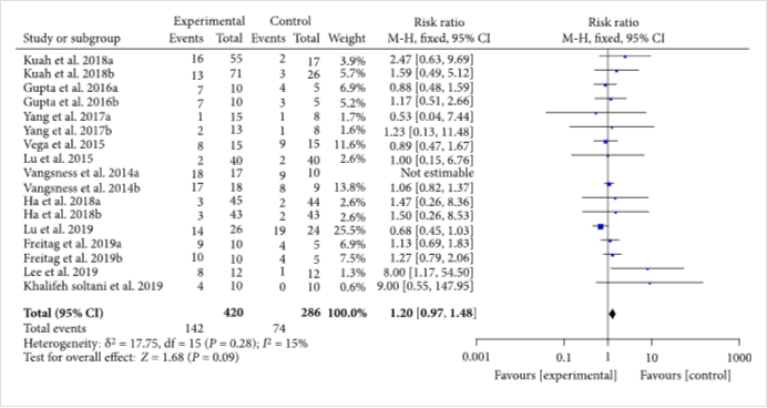 十項(xiàng)隨機(jī)對(duì)照試驗(yàn)報(bào)告了不良事件的數(shù)量或頻率。異質(zhì)性檢驗(yàn)表明異質(zhì)性較低(%,); 因此,采用固定效應(yīng)模型進(jìn)行分析。結(jié)果表明,MSC注射液與對(duì)照組的安全性無顯著差異[1.20(0.97,1.48),](圖5)。其他隨機(jī)對(duì)照試驗(yàn),所有人都沒有報(bào)告嚴(yán)重的不良事件。