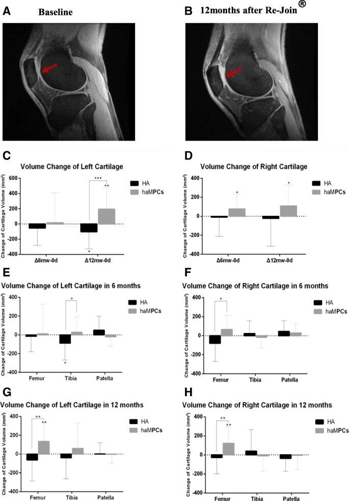 有趣的是,關節內注射Re-Join?對增加軟骨體積有影響,注射后12個月顯著增加。這種影響主要表現在股骨上。而在HA組中,可以觀察到總體積、股骨、脛骨和髕骨的軟骨減少,這與OA的自然進展過程非常相似。Re-Join?修復軟骨的作用是長效的,這與其再生潛力相一致,可能為OA患者提供有希望的治療干預和軟骨修復