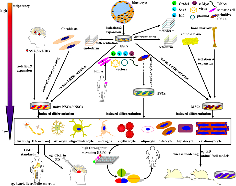 上述干細(xì)胞可分為ESCs、NSCs、MSCs和iPSCs四大類,伴隨著逐漸下降的全能性。