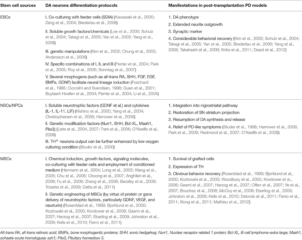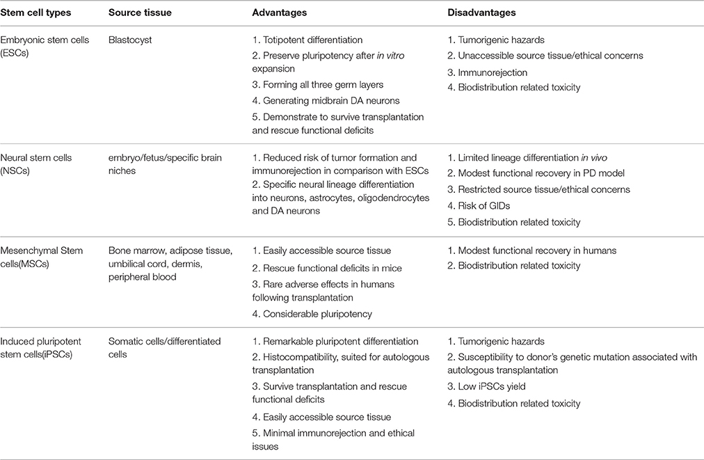 至于NSC,與ESC相比的一個(gè)潛在優(yōu)勢是,除了神經(jīng)譜系分化受限外,它們?cè)谝浦埠蟛灰仔纬赡[瘤和引起免疫排斥反應(yīng)。然而,神經(jīng)干細(xì)胞顯示出一些缺點(diǎn),如有限的分化能力和來源、揮之不去的倫理問題、帕金森癥狀的部分緩解。