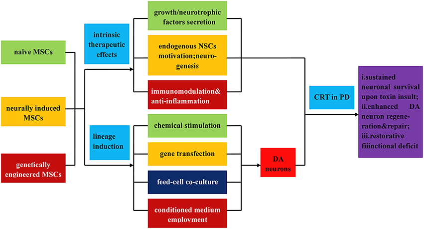 其中,干細(xì)胞衍生的神經(jīng)干細(xì)胞可以通過以下兩種方案進(jìn)一步誘導(dǎo)分化為多巴胺神經(jīng)元:(i)添加生長因子、神經(jīng)營養(yǎng)因子、細(xì)胞因子等。培養(yǎng)基誘導(dǎo)神經(jīng)球形成;(ii) 與永生化 NSC 系共培養(yǎng)以引入基因修飾因子。當(dāng)將上述可行的NSCs和感受態(tài)DA神經(jīng)元應(yīng)用于PD的CRT治療時(shí),可以觀察到改善的神經(jīng)元存活狀態(tài)和恢復(fù)性功能缺陷。