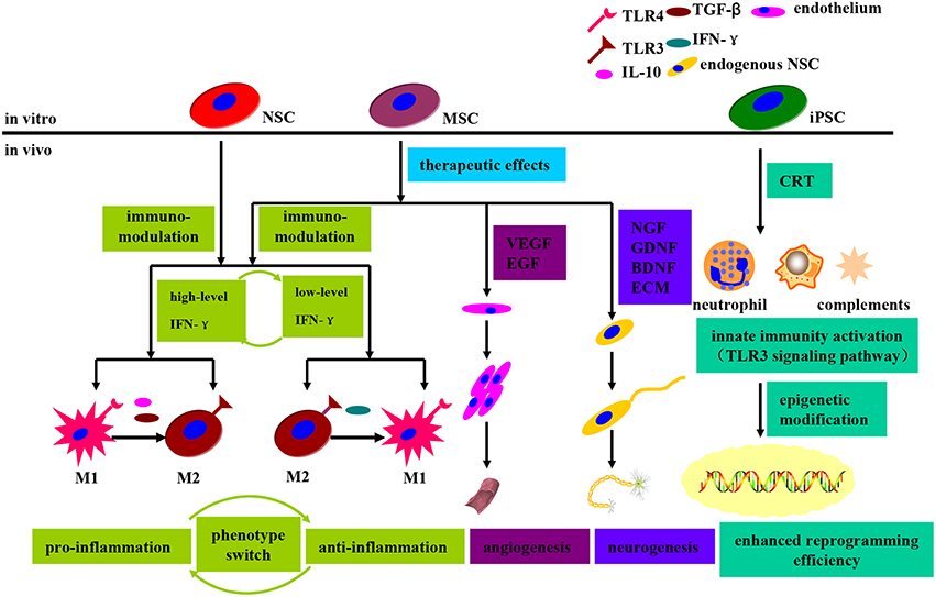 MSCs可分為三種類型:na?veMSCs、神經(jīng)誘導(dǎo)的MSCs和基因工程的MSCs,它們都可以在移植后直接發(fā)揮內(nèi)在治療作用,例如(i)分泌中性粒細(xì)胞因子、生長因子等;(ii) 內(nèi)源性 MSCs 動(dòng)機(jī)、神經(jīng)發(fā)生和血管生成;(iii) 免疫調(diào)節(jié)和抗炎作用。