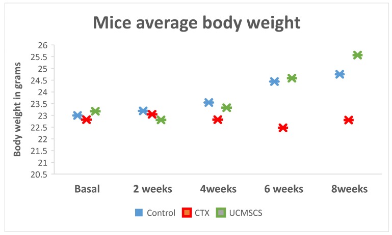 圖1:該圖顯示了與聯合化療 (CTX) 組體重顯著下降相比,干細胞組體重增加的趨勢。