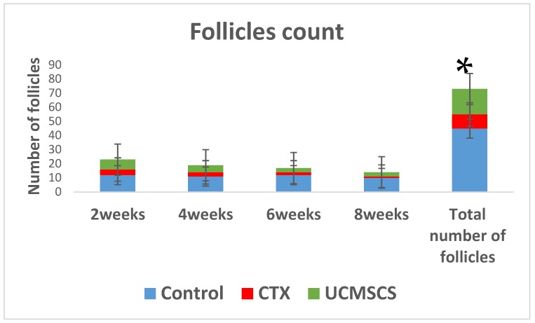 但總的來說,臍帶血間充質干細胞 (UCMSCs) 中的卵泡計數) 綠色組在CTX組中顯著增加 (* p<0.05)。