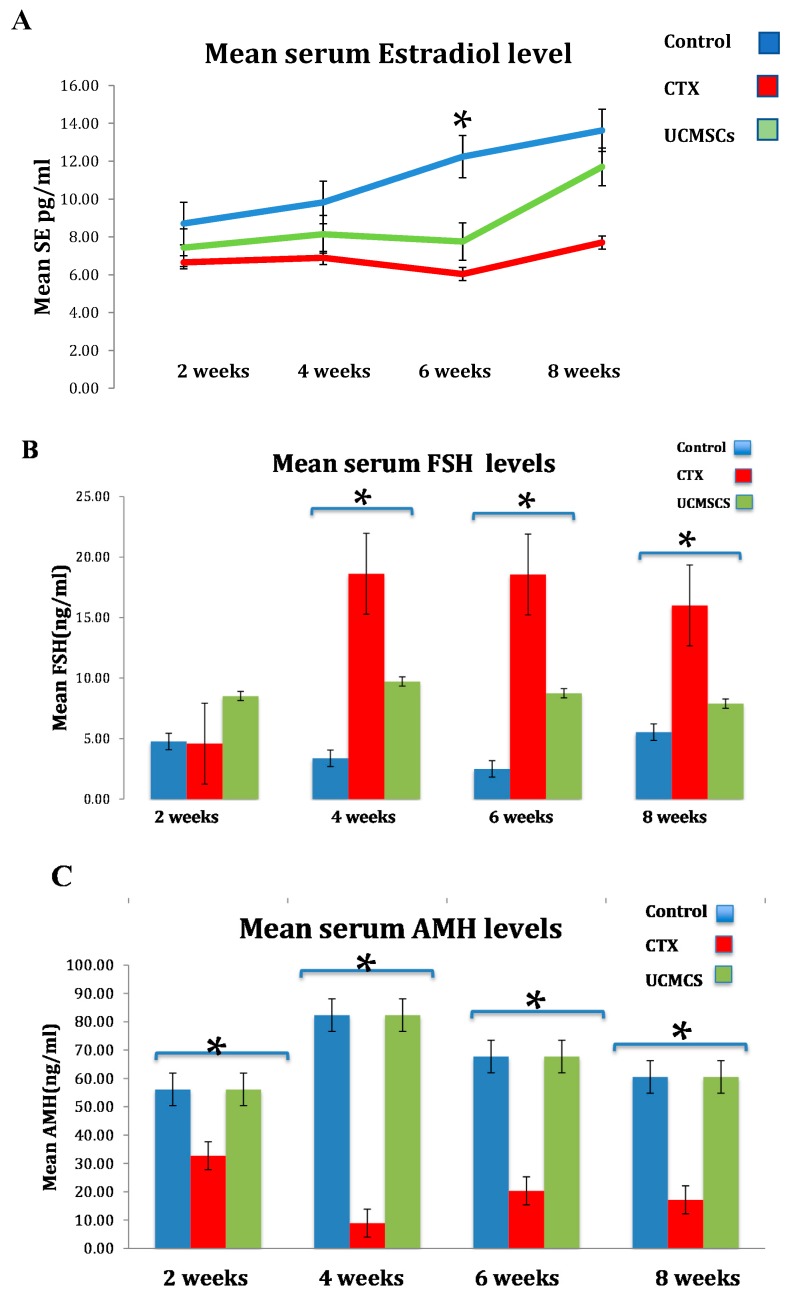 圖3:如 (A)中的條形圖所示,UCMSC顯著恢復了卵巢激素水平,雌二醇水平解釋了有利于UCMSC的上升;( B ) 4周及以上的UCMSCS中明顯表現出低促卵泡激素 (FSH) 水平;( C ) 在所有時間點,UCMSCS組的抗苗勒管激素 (AMH) 水平均顯著升高 (*p<0.05)。