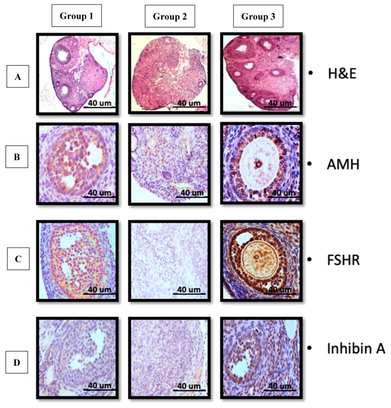 • BD) 與第2組相比,第1組和第3組分別證實了AMH和促卵泡激素受體 (FSHR) 和抑制素A的表達增加。(比例尺40μm)