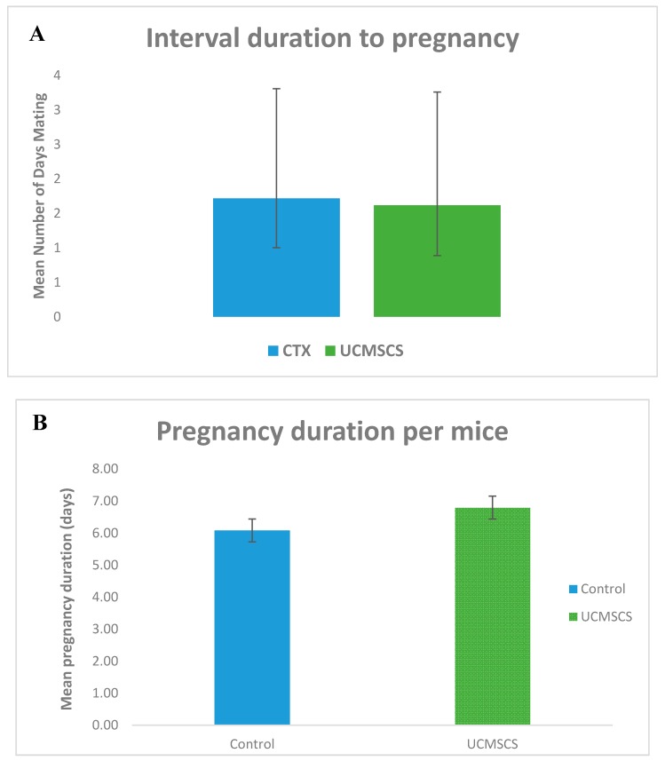 圖6:( A ) UCMSCS組pf幼崽數量增加,但未達到對照組的范圍;(B) 妊娠頻率與對照組相當。