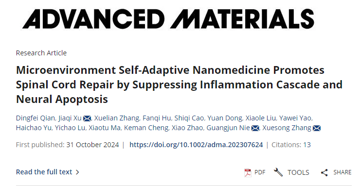 [15]D. Qian, J. Xu, X. Zhang, F. Hu, S. Cao, Y. Dong, X. Liu, Y. Yao, H. Yu, Y. Lu, X. Ma, K. Cheng, X. Zhao, G. Nie, X. Zhang, Microenvironment Self-Adaptive Nanomedicine Promotes Spinal Cord Repair by Suppressing Inflammation Cascade and Neural Apoptosis. Adv. Mater. 2024, 36, 2307624. https://doi.org/10.1002/adma.202307624