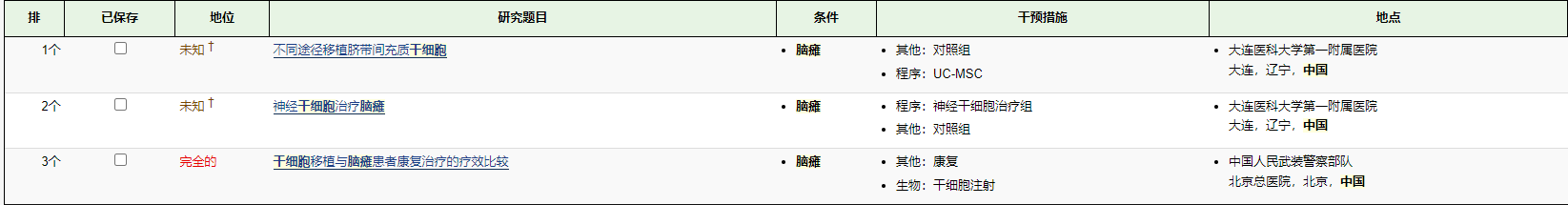 | 9 | | 未知 ? | 神經干細胞治療腦癱 | 腦癱 | 程序:神經干細胞治療組其他:對照組 | 大連醫科大學第一附屬醫院 |