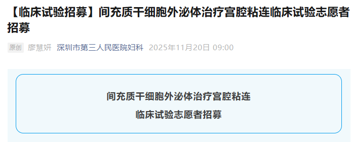 11月20日,深圳市第三人民醫(yī)院啟動了一項”間充質(zhì)干細(xì)胞外泌體治療宮腔粘連臨床試驗志愿者招募“的研究。[7]