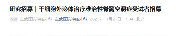 11月21日,宣武醫(yī)院神經(jīng)外科啟動了一項名為”評價人臍帶間充質(zhì)干細(xì)胞外泌體注射液(hUC-MSCs-EV)治療難治性脊髓空洞癥(syringomyelia)患者的臨床安全性和有效性研究。“的臨床招募。[8]