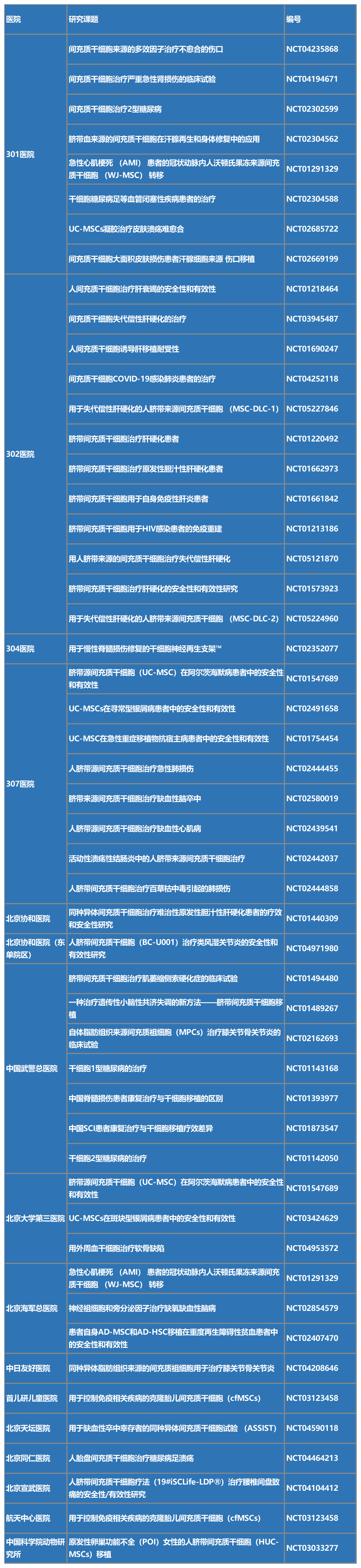 北京,作為我國的首都,一直是中國醫(yī)療科研的重要中心。近年來,北京的醫(yī)院在干細胞研究領(lǐng)域也取得了顯著的進展。通過在全球臨床試驗注冊平臺ClinicalTrials.gov上的檢索,我們發(fā)現(xiàn)北京的多家醫(yī)院,包括301醫(yī)院、302醫(yī)院、304醫(yī)院、307醫(yī)院、協(xié)和醫(yī)院、武警總醫(yī)院、兒童醫(yī)院、同仁醫(yī)院以及宣武醫(yī)院等,都在積極開展間充質(zhì)干細胞臨床試驗。(截于2023年5月),包括不限于這些項目: