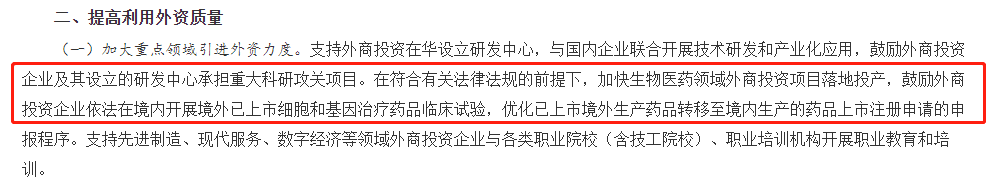 《意見》中的加大重點領(lǐng)域引進外資力度,包含支持外商投資在華設(shè)立研發(fā)中心,與國內(nèi)企業(yè)聯(lián)合開展技術(shù)研發(fā)和產(chǎn)業(yè)化應(yīng)用,鼓勵外商投資企業(yè)及其設(shè)立的研發(fā)中心承擔重大科研攻關(guān)項目。在符合有關(guān)法律法規(guī)的前提下,加快生物醫(yī)藥領(lǐng)域外商投資項目落地投產(chǎn),鼓勵外商投資企業(yè)依法在境內(nèi)開展境外已上市細胞和基因治療藥品臨床試驗,優(yōu)化已上市境外生產(chǎn)藥品轉(zhuǎn)移至境內(nèi)生產(chǎn)的藥品上市注冊申請的申報程序。支持先進制造、現(xiàn)代服務(wù)、數(shù)字經(jīng)濟等領(lǐng)域外商投資企業(yè)與各類職業(yè)院校(含技工院校)、職業(yè)培訓(xùn)機構(gòu)開展職業(yè)教育和培訓(xùn)。