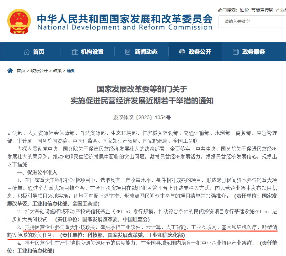 8月1日,國(guó)家發(fā)改委等部門(mén)聯(lián)合發(fā)布關(guān)于實(shí)施促進(jìn)民營(yíng)經(jīng)濟(jì)發(fā)展近期若干舉措的通知,聚焦促進(jìn)公平準(zhǔn)入、強(qiáng)化要素支持、加強(qiáng)法治保障、優(yōu)化涉企服務(wù)、營(yíng)造良好氛圍等5個(gè)重要方面,提出28條具體措施。其中在“促進(jìn)公平準(zhǔn)入”方面指出要“支持民營(yíng)企業(yè)參與重大科技攻關(guān),牽頭承擔(dān)工業(yè)軟件、云計(jì)算、人工智能、工業(yè)互聯(lián)網(wǎng)、基因和細(xì)胞醫(yī)療、新型儲(chǔ)能等領(lǐng)域的攻關(guān)任務(wù)”。(來(lái)源:國(guó)家發(fā)改委官網(wǎng))